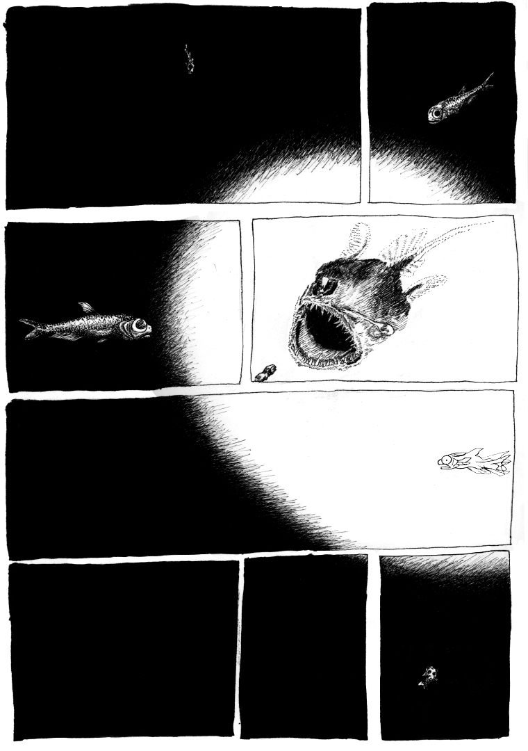 encre noire sur papier 2012-2016 Dans les BD "Abysses" j'ai expérimenter différents codes de lectures séquentiels.
