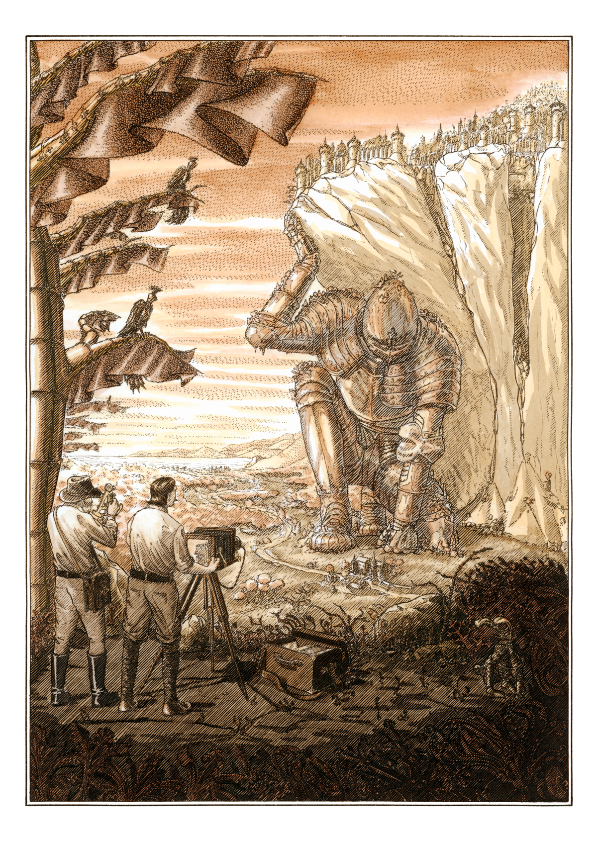 2023 Ce dessin a été réalisé dans le cadre d'un appel à projet demandant à des artistes d'imaginer la couverture d'un roman de Jules Verne fictif.