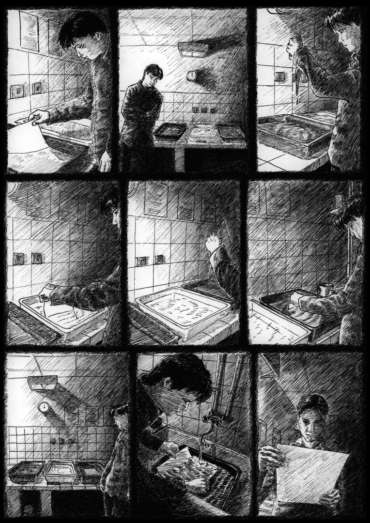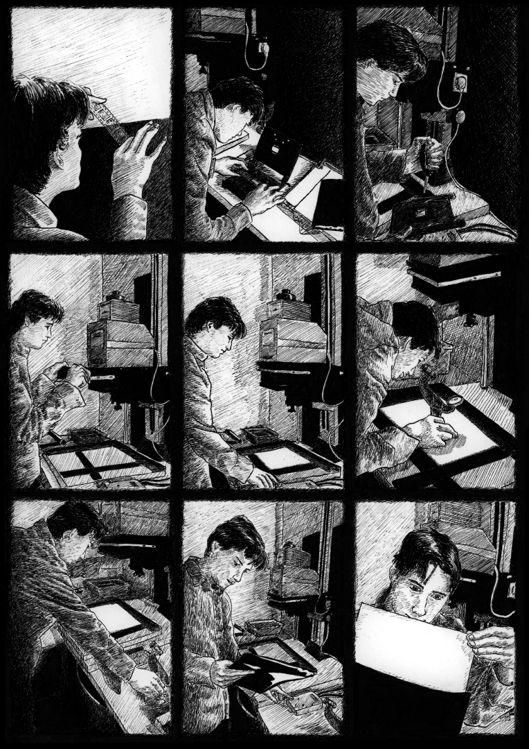 The light in these five comic strips comes from a single light source located in the middle of the story. In this panel, the photographic paper is exposed to light. At this moment, a phenomenon occurs that seems to dematerialize the light. The light-sensitive photographic paper, which is blank before exposure, receives the light from an image for a chosen period of time. The paper is then exposed, and the projected photons form silver atoms on the illuminated areas. The image is therefore physically present, although it is not yet visible. It is a curious moment during which light is the source of an invisible image. When the image is slow in coming.