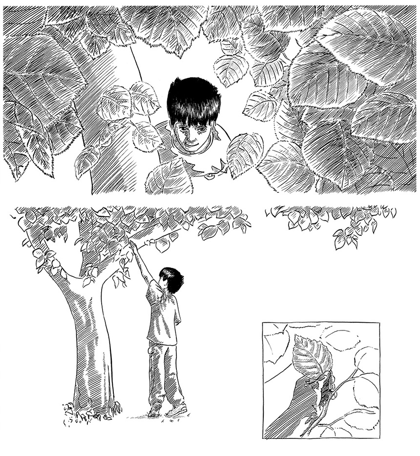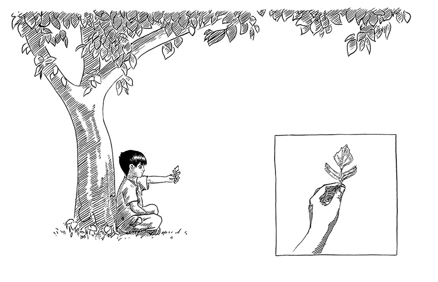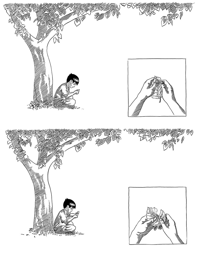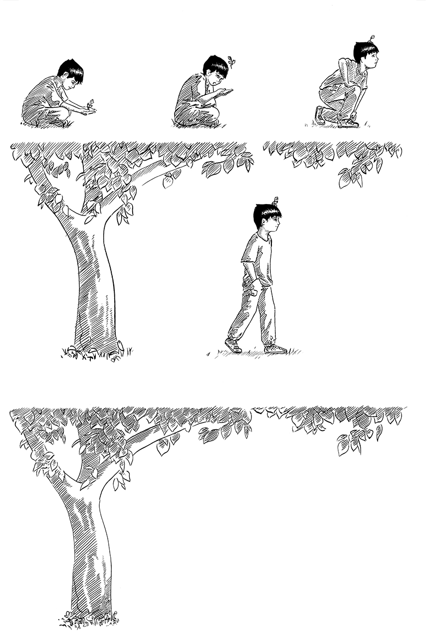encre noire sur papier 2018 Petite histoire mettant en scène une marionette que je m'amusait à faire avec les feuilles d'arbres étant petit.