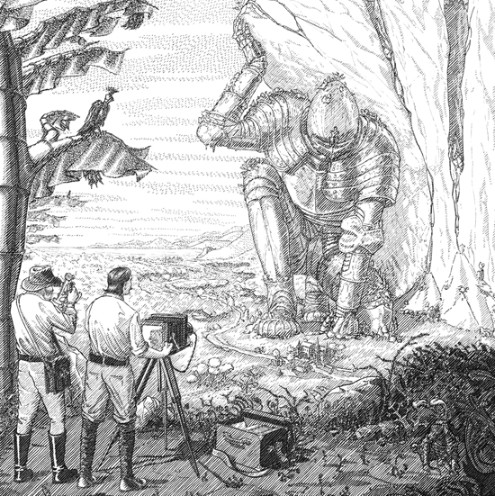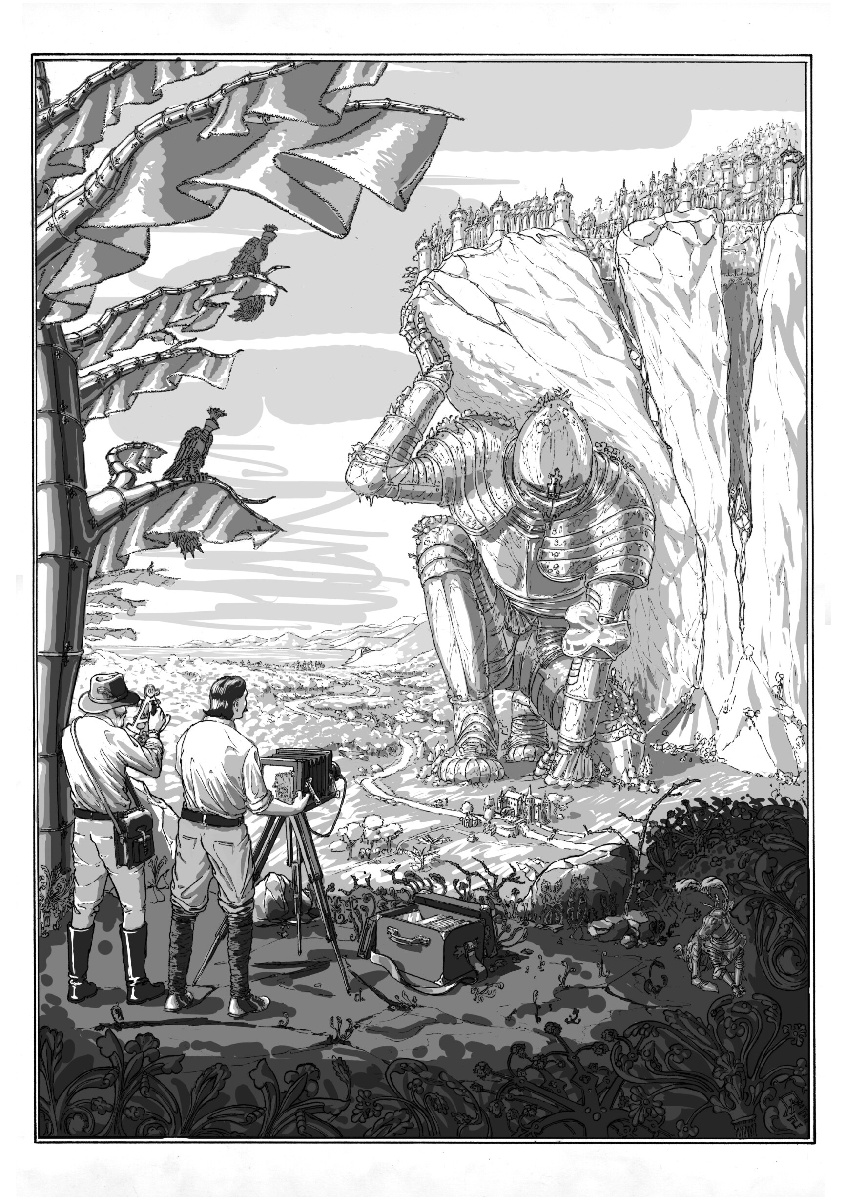 2023 Ce dessin a été réalisé dans le cadre d'un appel à projet demandant à des artistes d'imaginer la couverture d'un roman de Jules Verne fictif.