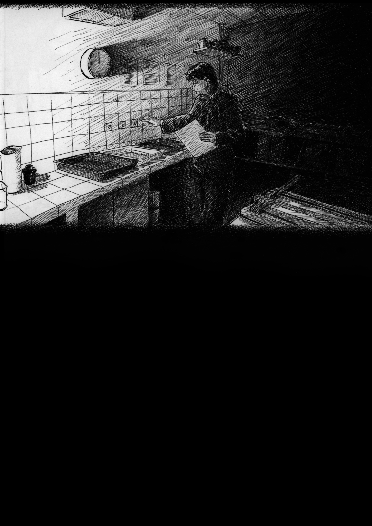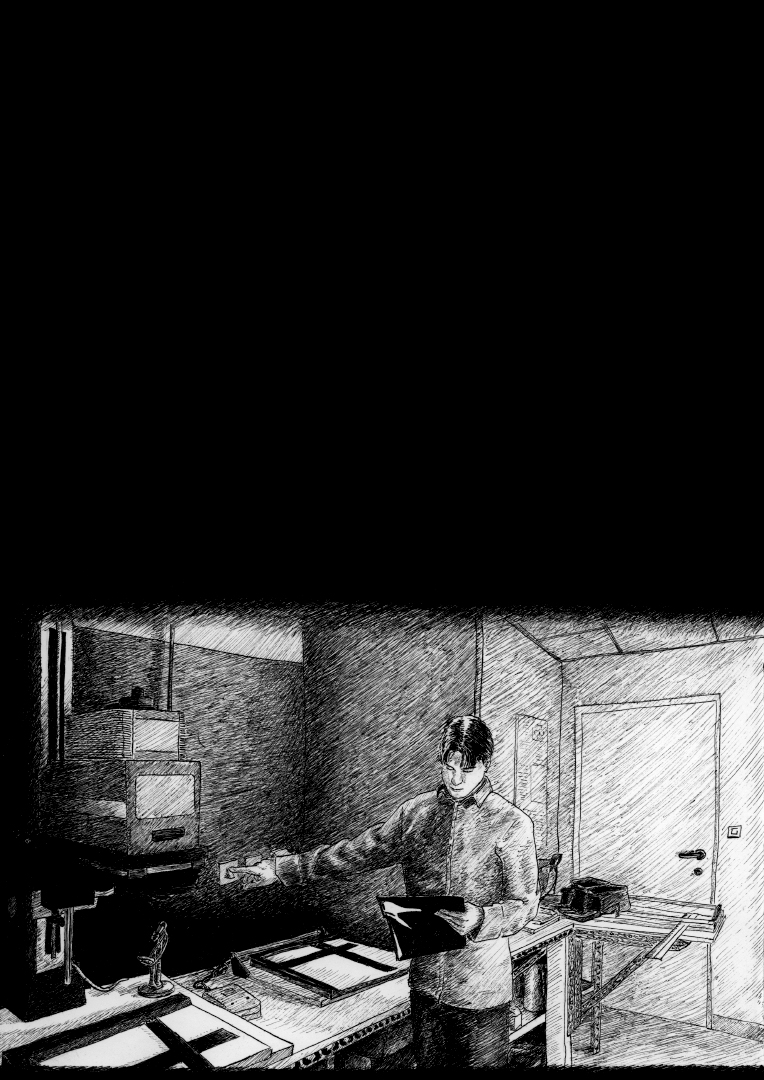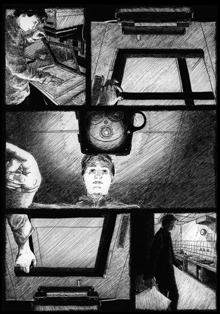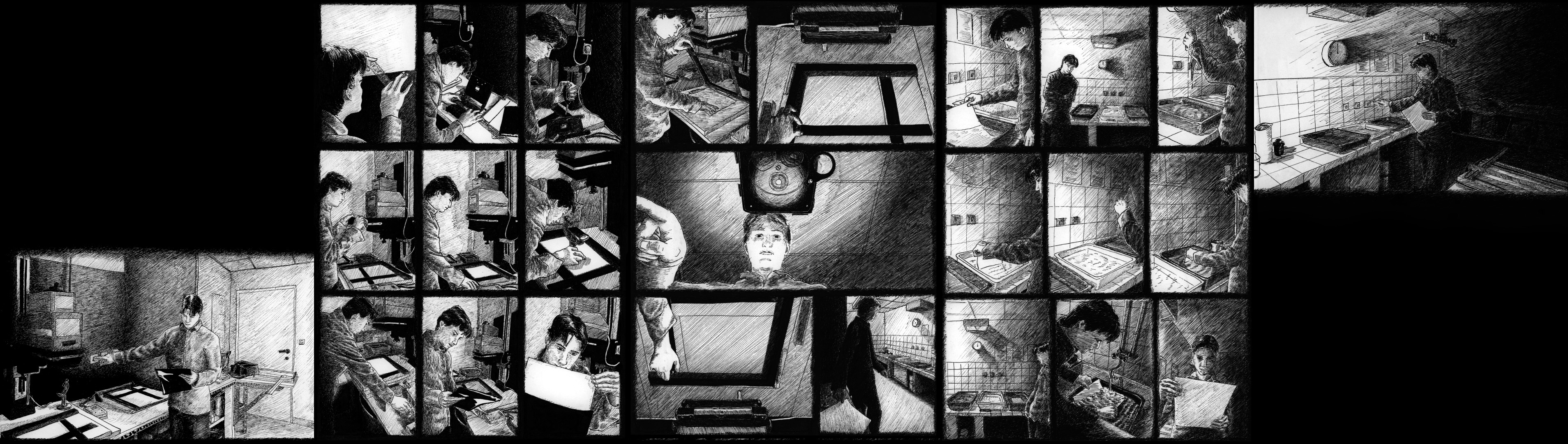 The light in these five comic strips comes from a single light source located in the middle of the story. In this panel, the photographic paper is exposed to light. At this moment, a phenomenon occurs that seems to dematerialize the light. The light-sensitive photographic paper, which is blank before exposure, receives the light from an image for a chosen period of time. The paper is then exposed, and the projected photons form silver atoms on the illuminated areas. The image is therefore physically present, although it is not yet visible. It is a curious moment during which light is the source of an invisible image. When the image is slow in coming.
