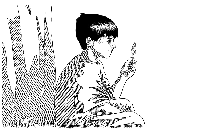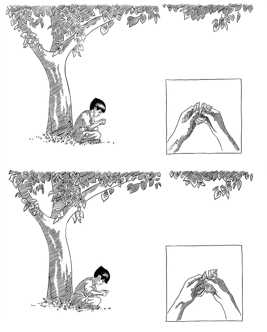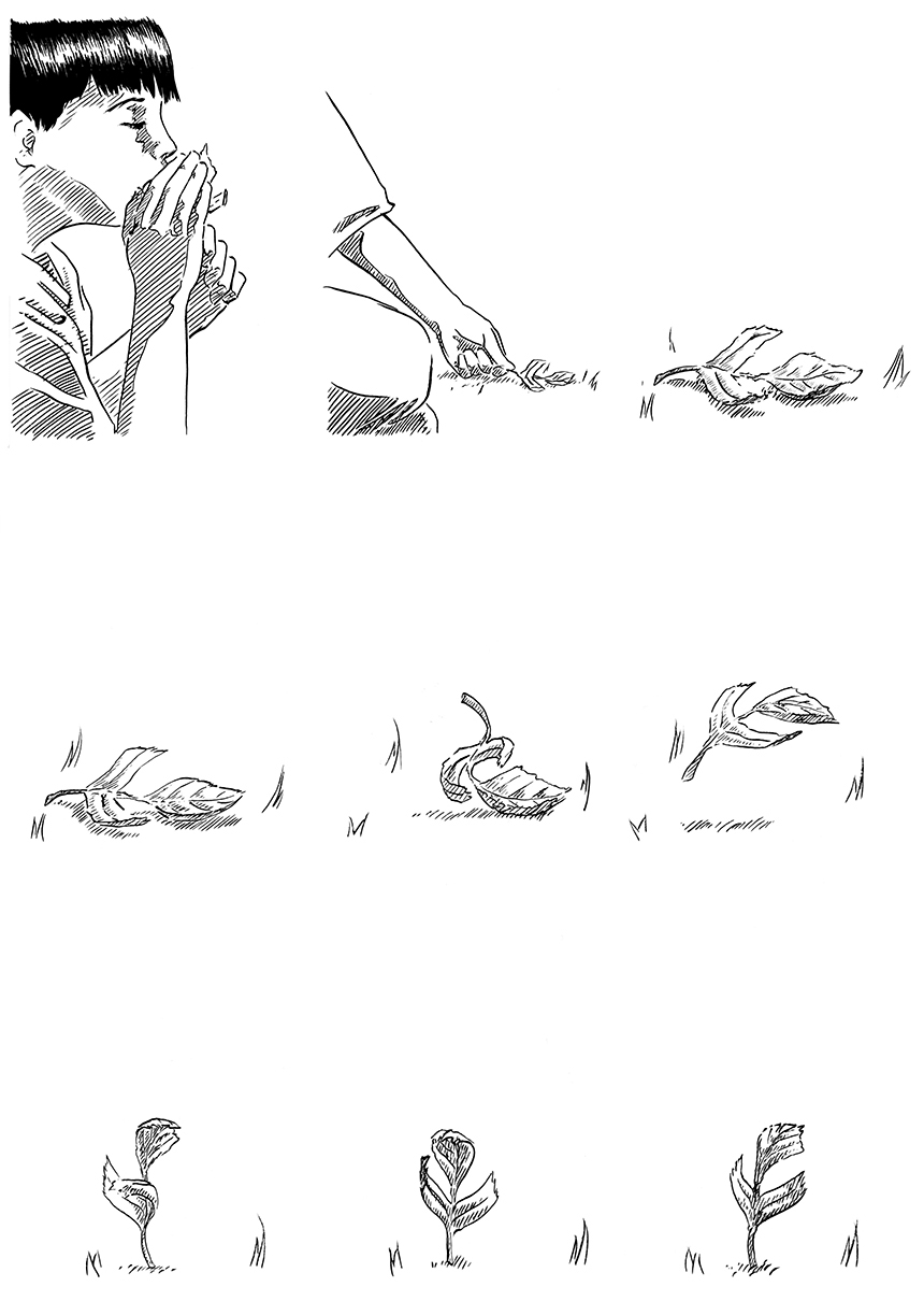 encre noire sur papier 2018 Petite histoire mettant en scène une marionette que je m'amusait à faire avec les feuilles d'arbres étant petit.