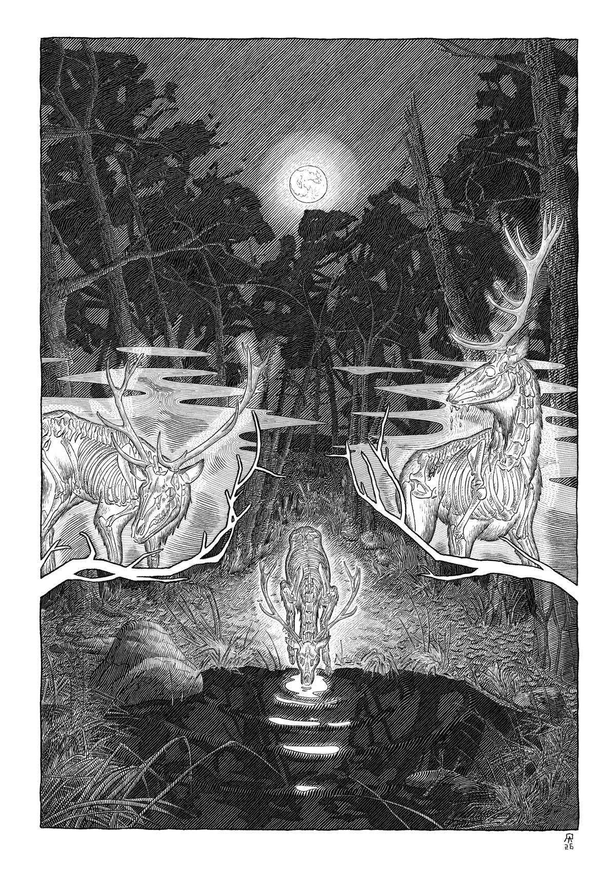 encre noire sur papier 2025-2026 Test de “haïku fantastique BD”, accompagné des étapes de réalisations.